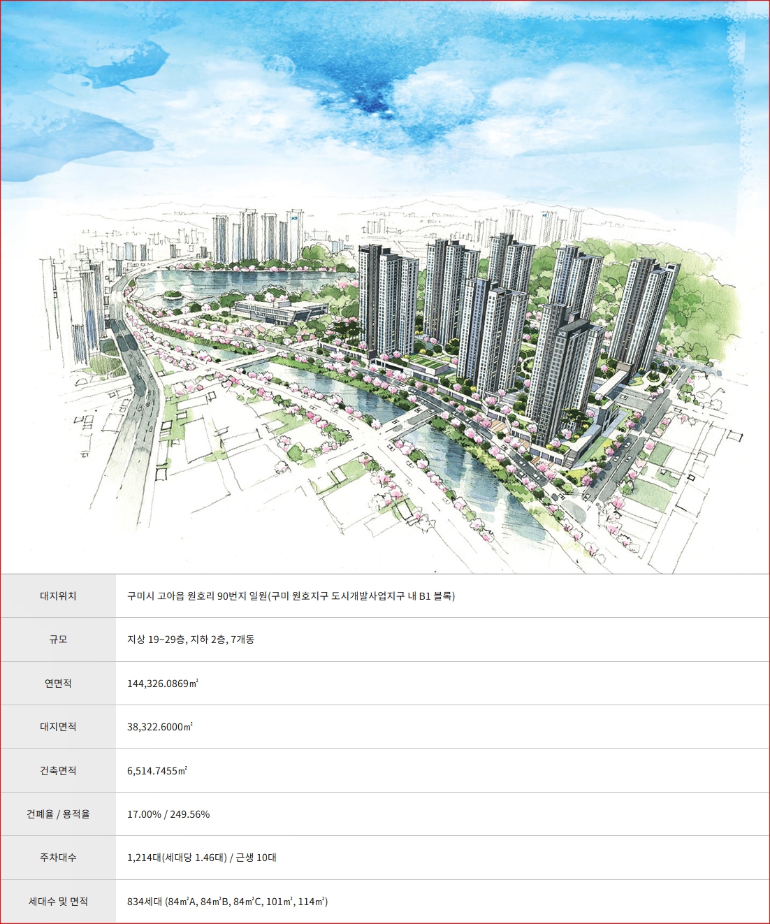 '구미 원호 자이 더 포레' 아파트 단지는 구미시 고아읍 원호리 90번지 일원 '구미 원호지구 도시개발사업지구 내 B1블록'에 위치해 지하 2층, 지상 19~29층, 총 7개 동으로 전용면적 84㎡~114㎡ 타입으로 구성되어 있습니다.