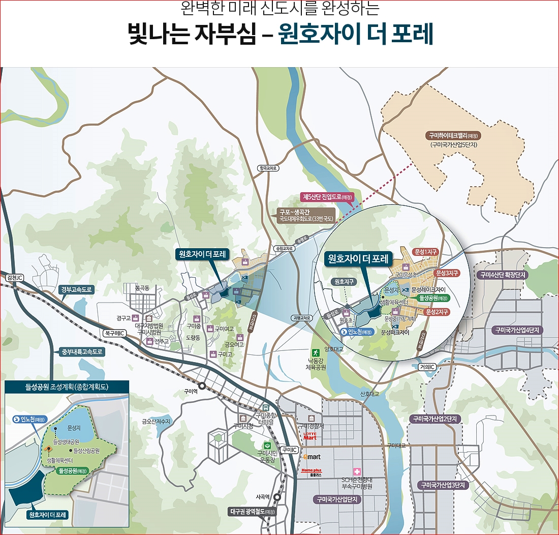 또한, 단지 주변으로 구미 문성 1지구부터 3지구까지 위치해 있으며, 차량으로 약 5분 ~ 10분 거리 이내로 북구미IC, 구미IC, 구미국가산업단지, 생활 편의시설 등이 위치해 있습니다.
