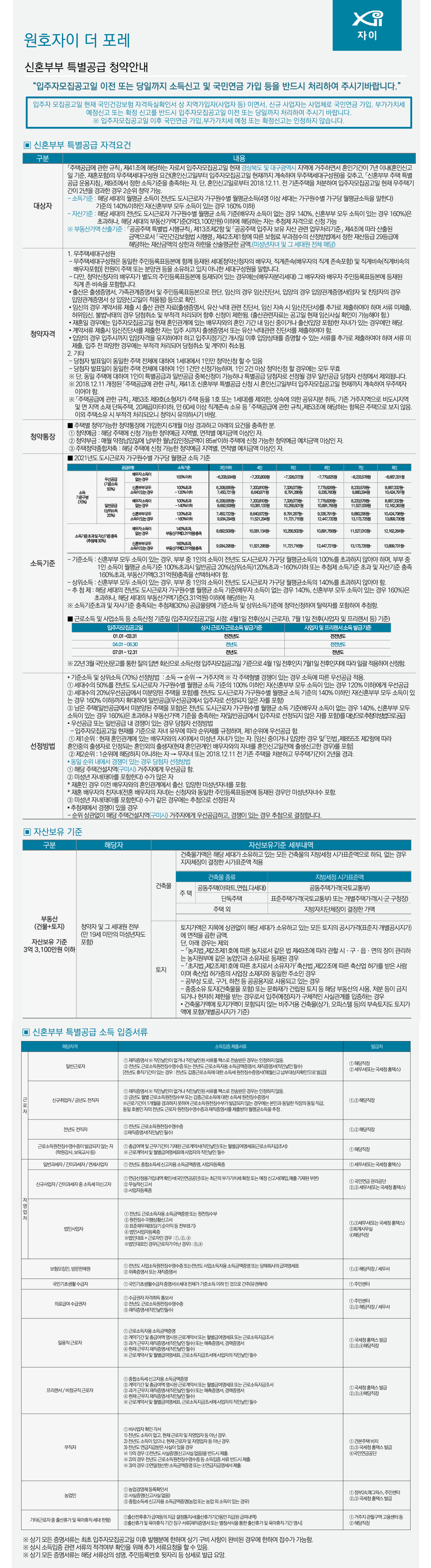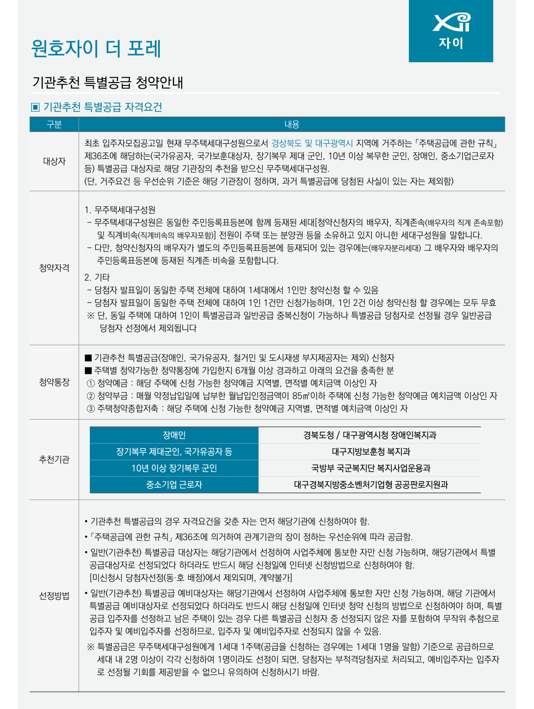 '구미 원호 자이 더 포레' 아파트 단지의 특별공급, 일반공급, 주의사항 안내입니다.