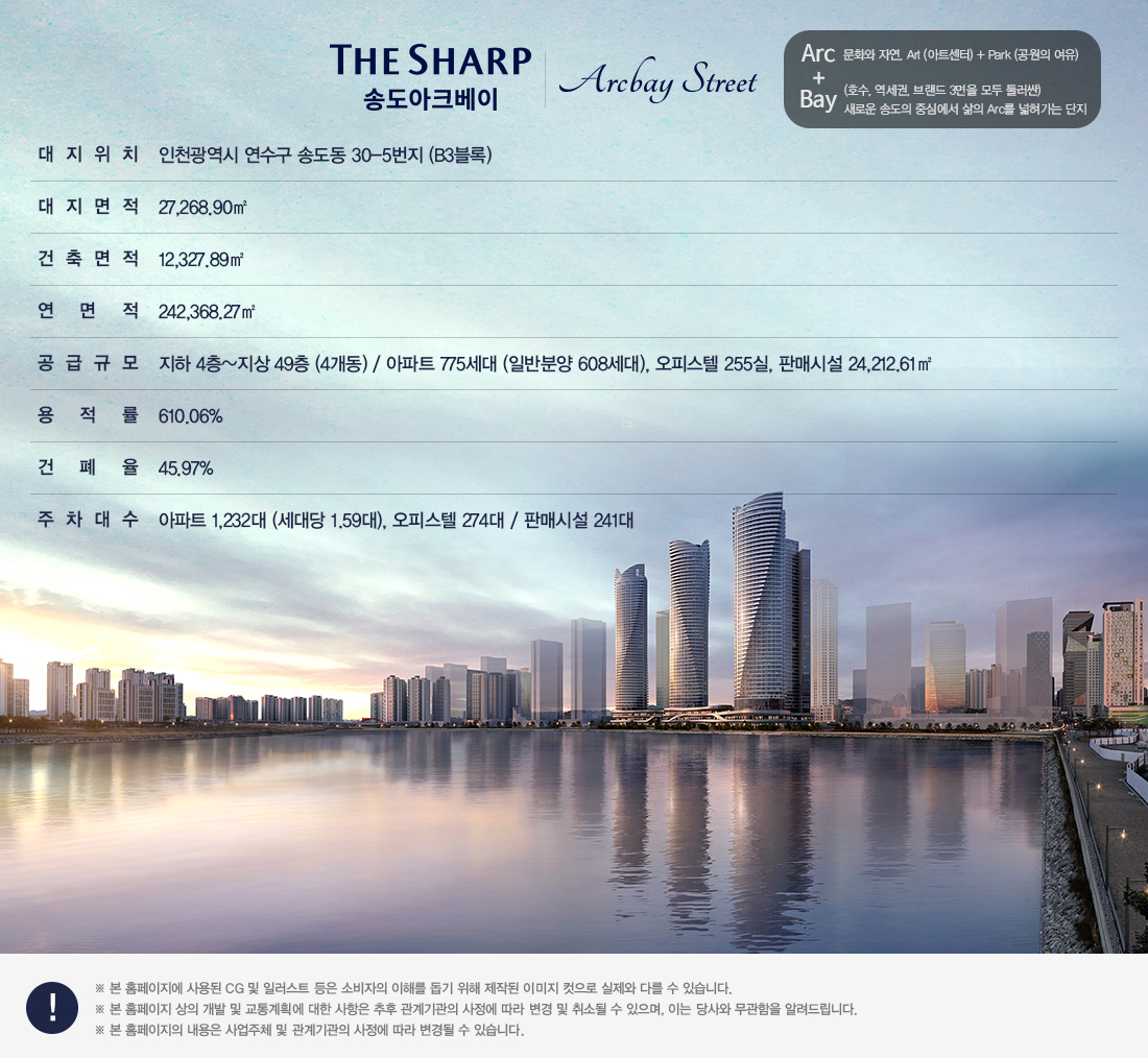 송도 더샵 아크베이 아파트는 인천시 연수구 송도동 30-5번지 일원, 송도국제신도시 1공구 B3블록에 위치해 지하 4층, 지상 최고 49층, 4개 동으로 전용 84㎡~179㎡ 중대형 평형으로 구성된 주상복합형 아파트 단지입니다. 공급되는 전용 타입 세대수로는 84㎡ 174세대, 98㎡ 94세대, 112㎡ 99세대, 121㎡ 232세대, 155㎡ 3세대, 168㎡ 3세대, 179㎡ 3세대로 총 1,030세대 중 오피스텔 255실과 아파트 775세대를 공급하며 이 중 608세대를 일반 분양할 예정입니다.