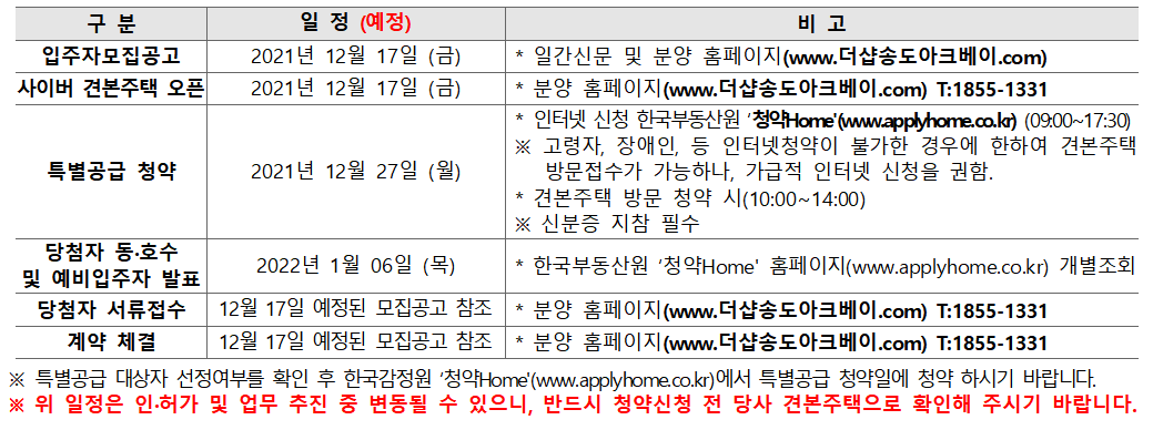 * 송도 더샵 아크베이 아파트 분양 일정은 본 게시글 하단부에 첨부하였습니다. 사업주체측 사정에 따라 분양 일정이 변경될 수 있으니 참고하시기 바랍니다.
