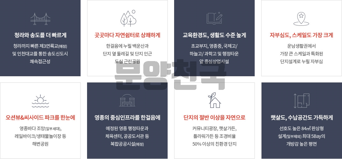 또한, 탄탄한 미래가치로 양질의 일자리도 기대되고 있습니다. 미단시티 복합리조트(예정), 인스파이어 복합리조트(예정), 세계 한상드림아일랜드(예정),로 도시 기능 확장 및 대규모 일자리 창출도 예견되며 영종 중학교, 영종 국제고등학교, 인천 하늘 고등학교, 인천 과학고등학교 등 명문 학군이 있어 교육환경도 우수합니다.