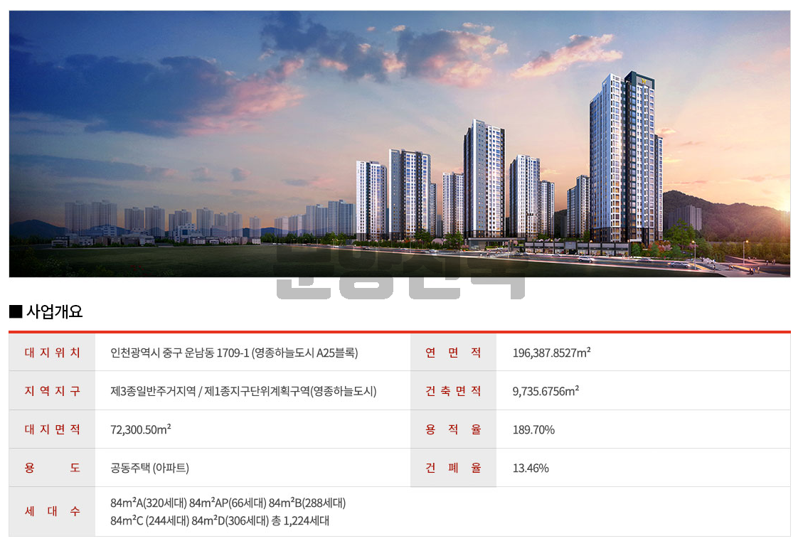 영종도 대성 베르힐 아파트는 인천시 중구 운남동 1709-1번지 영종하늘도시 A25블록에 위치하여 지하 1층~지상 25층 높이로 13개 동, 총 1,224세대를 공급할 예정입니다.