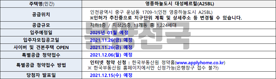 2021년 11월 26일(금요일) 영종하늘도시 대성 베르힐 아파트 입주자 모집 공고를 시작과 동시에 사이버 및 모델하우스 견본 주택을 오픈할 예정입니다. 12월 06일(월요일)은 특별 공급 청약 접수, 12월 15일(수요일) 아파트 당첨자 발표를 할 예정이며 일반 1순위 청약 접수일은 2021년 12월 07일(화요일) 예정입니다.