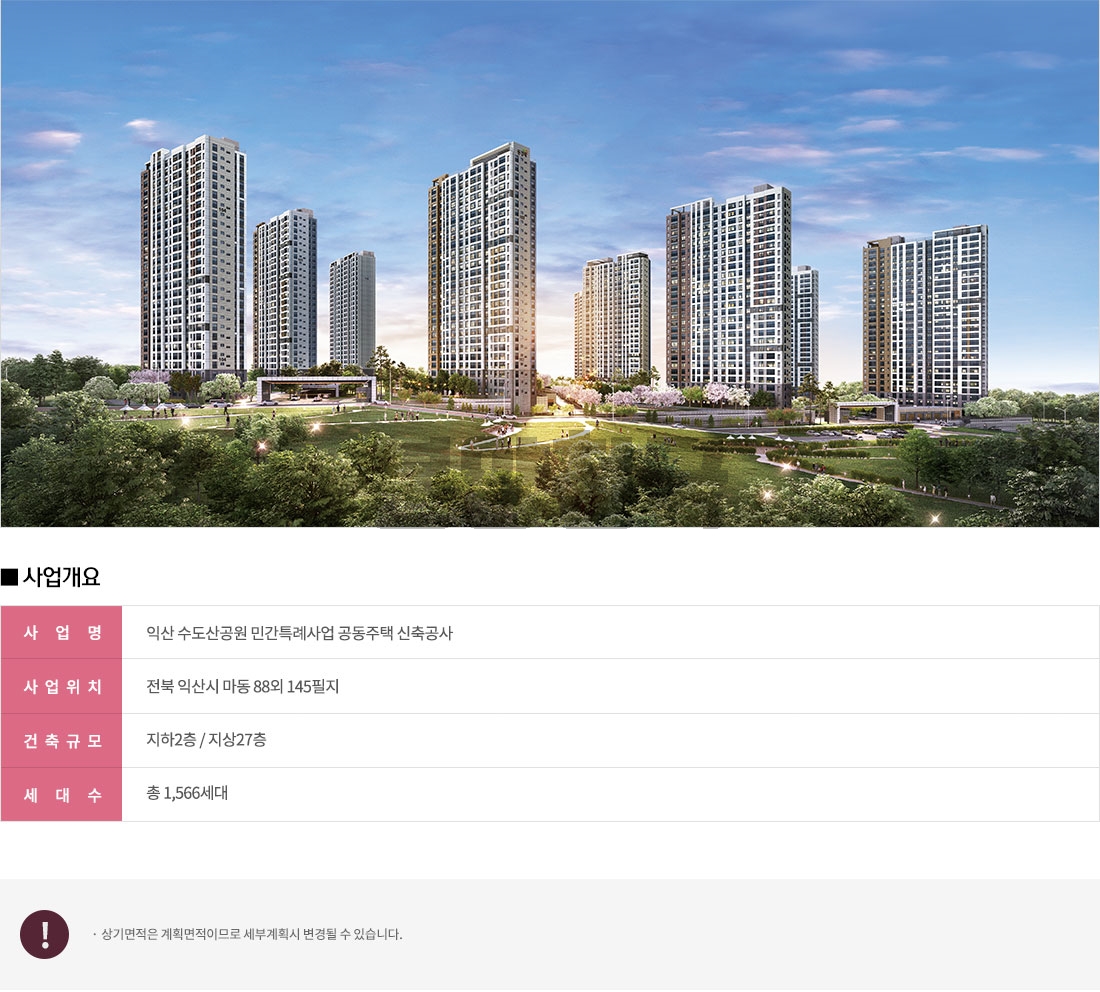 익산 제일풍경채 센트럴 파크 아파트는 전북 익산시 마동 88번지 외 145필지로 조성되는 아파트 단지로서 지하 2층~지상 27층 높이, 12개동으로 조성됩니다. 공급되는 전용 타입은 59㎡~107㎡ 타입으로 총 1,566세대를 공급할 예정입니다.