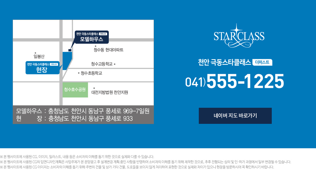 천안 극동스타클래스 더퍼스트 아파트 모델하우스 견본주택은 충남 천안시 동남구 풀세로 969-7번지 일원에 위치해 있습니다.