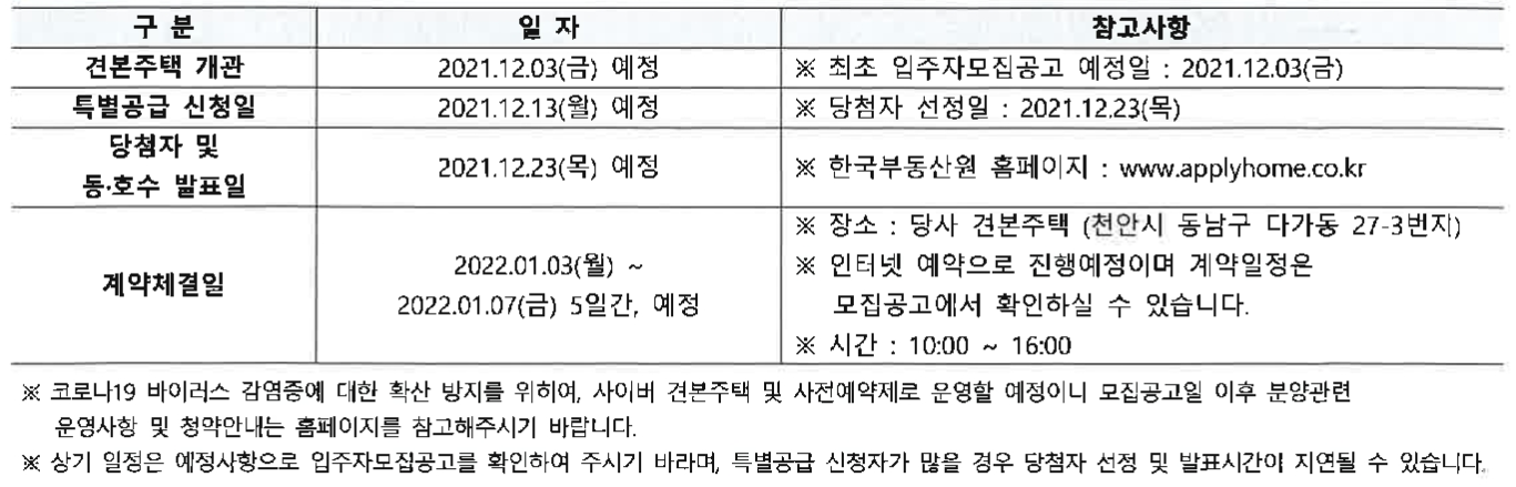 2021년 12월 03일(금요일) 아파트 입주자 모집공고와 모델하우스 견본주택 개관 예정, 2021년 12월 13일(월요일) 아파트 특별공급 청약 접수일 예정, 2021년 12월 23일(목요일) 아파트 당첨자 및 동 호수 발표 예정일, 2022년 01월 03일(월요일) ~ 01월 07일(금요일) 5일간 아파트 당첨자 계약 체결 예정일입니다.