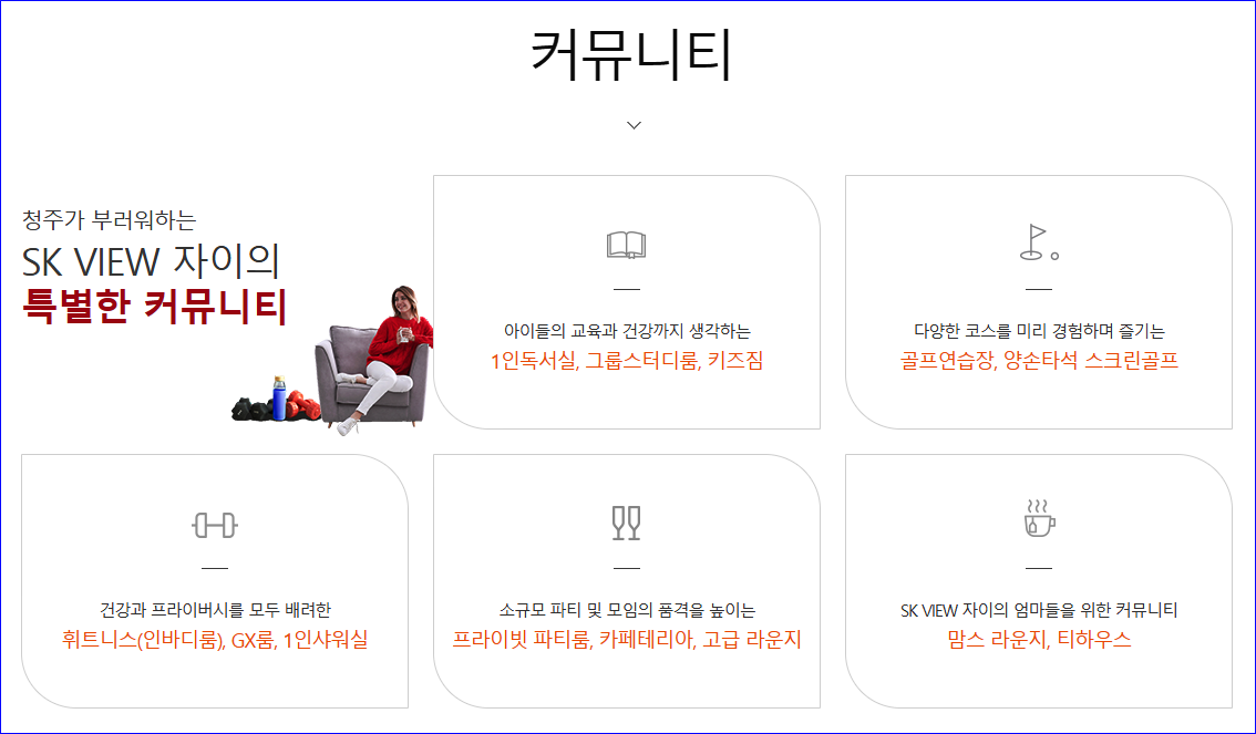 '청주 봉명 SK뷰 자이' 아파트 커뮤니티 시설로는 1인 독서실, 그룹스터디룸, 키즈짐, 골프연습장, 양손타석 스크린 골프, 휘트니스(인바디룸), GX룸, 1인 샤워실, 프라이빗 파티룸, 카페 테리아, 고급 라운지, 맘스 라운지, 티하우스 등이 형성될 예정입니다.